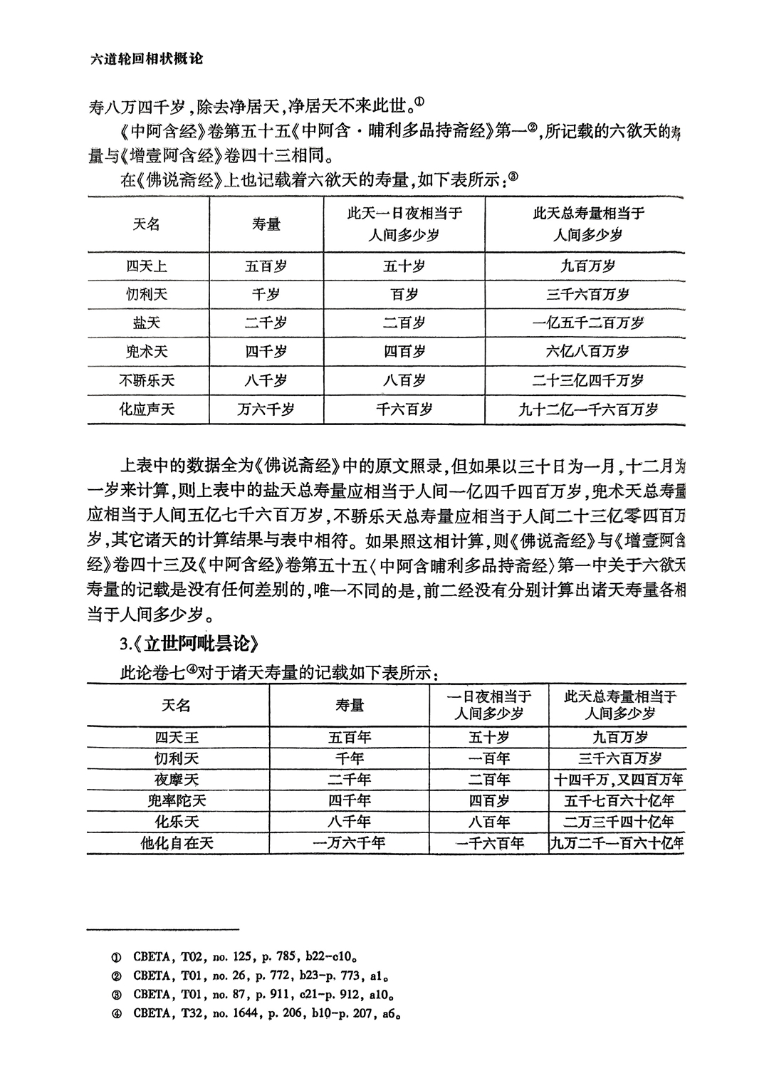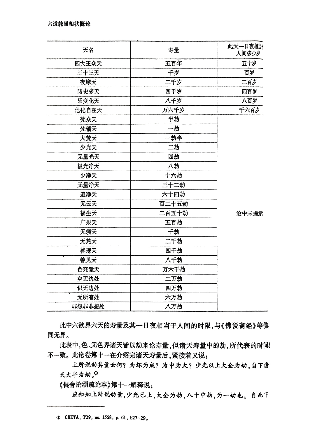 | 四天王天 | 天龙八部多为此天所摄;人间五十年,为四天王天一昼夜;四王天人寿为五百岁(以本天时间为标准);身长半里;天衣十二铢(二十四铢为一两);形交成淫,与人无别,然风气泄,热恼便除,非如人间有余不净。 |