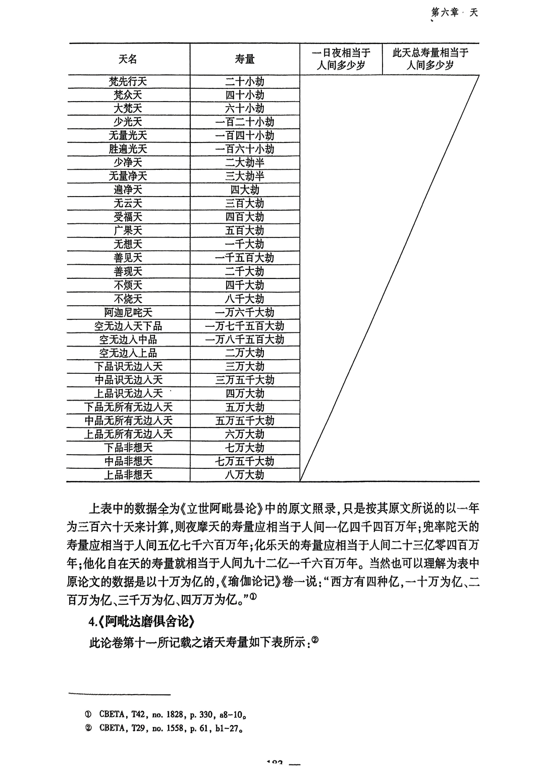 四空天 | 非想非非想处天 | 寿命8万大劫 成语:想入非非 | 识性不动,以灭穷研,于无尽中发宣尽性,如存不存,若尽非尽。如是一类,名为非想非非想处。 |