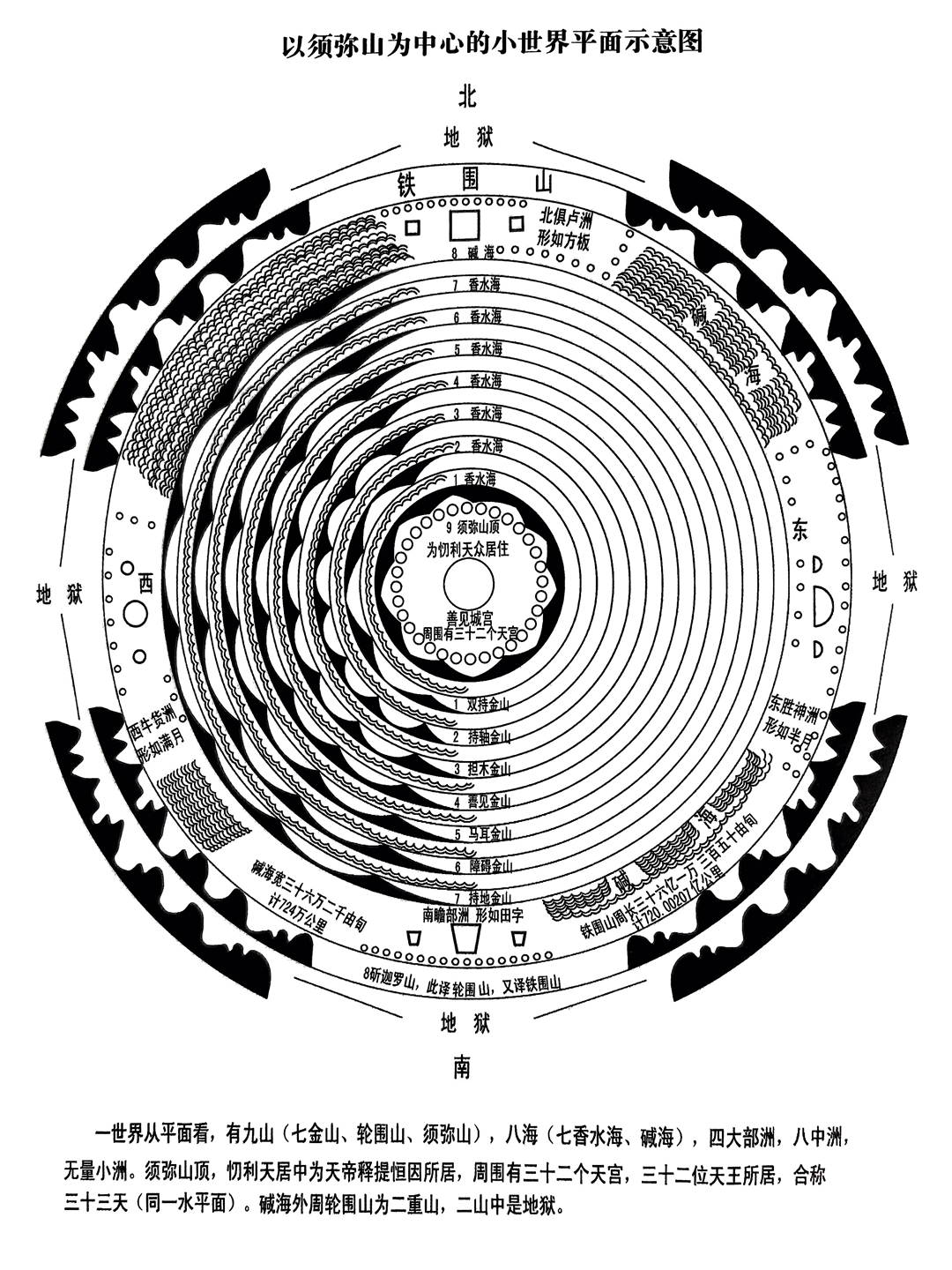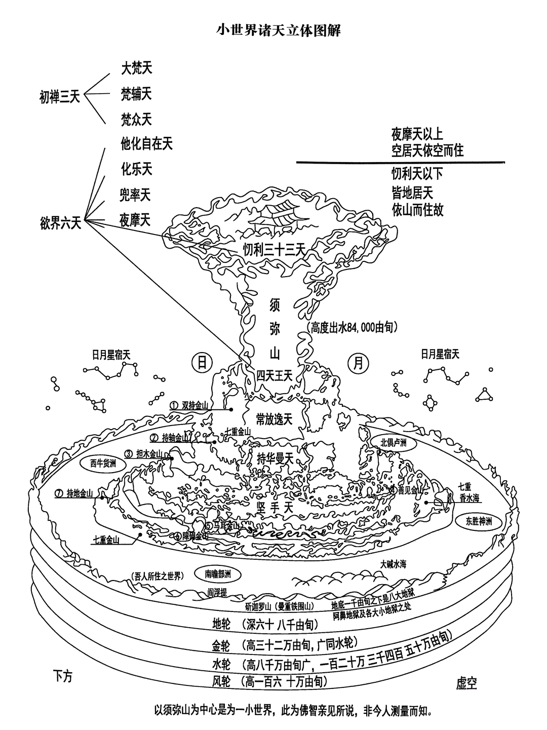日月围绕着须弥山运转,日月照临的范围,即以须弥山为中心的四大洲,名为一小世界(包括地狱、天等领域)我们地球处于四大洲的南瞻部洲。如下一小世界图(来自或整理自香港版《大方广佛华严经》):