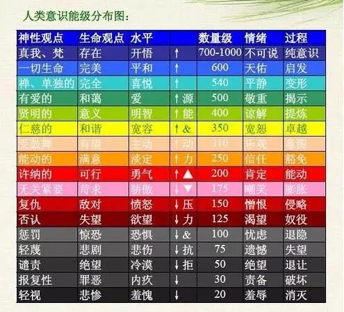 经过科学家的大量试验,得出了如上图所示的《人类意识能级分布图》,这幅图清晰地表现了人体能量层级,其中不同颜色光晕代表的不同情绪以及意识能量水平。