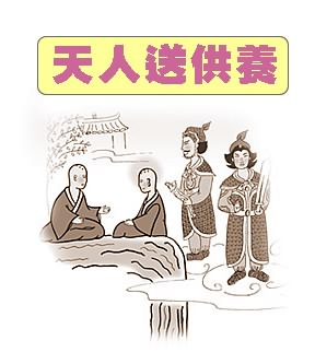 但是,左等右等,中餐竟然没有送到,眼看时间已经超过午时,他只好跟窥基法师连声抱歉,只好大家一起饿肚子啰。(道宣厉遵佛制,日中一餐,过午不食。)而窥基法师也不以为意。于是两人聊天喝茶,不觉日之将暮。于是道宣大力留客,请窥基法师留宿一晚,(他要窥基享受一下苦行的乐趣,睡一睡茅棚看滋味如何)窥基法师也在盛情难却之下留了下来。当晚,道宣法师一如往昔整晚打坐,不倒单,胁不至席。而窥基法师呢?却是翻来覆去,而且酣声如雷。道宣被他吵了一整晚,他心想:这还像出家人吗?明天一定要好好的数落他一顿。依照出家人的礼仪,行住坐卧都有规矩的。常言道:行如风,立如松,坐如钟,卧如弓。像窥基大师这样睡姿的出家人大概很少了。第二天一早起来,道宣就开始数落窥基的不是,说他睡没有睡相,不守规矩,而且酣声如雷,害他整晚不得休息。窥基法师说:昨晚吵得人家不得安眠的,不知道是谁哩!昨天晚上有一个人在打坐,半夜有只虱子咬了他一口,这个人很生气的抓起虱子,想要捏死它,但是一想--不能杀生,于是心不甘情不愿的把虱子往地上一丢,那只虱子不幸摔断了一条腿,整晚哀哀叫,害我不得安眠道宣法师一听,脸都绿了,因为昨天晚上真的有一只虱子咬他,被他丢到地上。。。。,他不是在睡觉吗?而且睡得打鼾,怎么知道的?终于,窥基法师告辞下山,而这时午时又至,送外脍的天女也来了。道宣法师一看到天女,很生气的说:你是故意拆我的台吗?昨天我有客人你为什么没送来啊?天女一脸无辜的回答说:我昨天也有送来啊!但是到了这里,你这个终南山整个被五彩祥云笼罩,而且四方有四大天王守护着,我只是一个小小的天女,进不来啊!到底昨天在这里的是什么客人啊?道宣法师一听,哑口无言也!