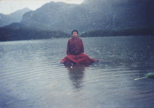 这张相片是03年喇荣五明佛学院的一位喇嘛给的。喇嘛叫索南,青海玉树人,是晋美彭措法王身边的一位工作人员,负责法王讲课时的音响事务。他说,相片中的这位僧人是他的弟弟,名叫扎嘉(记的不是太清楚了),是玉树当地的一位颇为出名的扎龙(藏传气功,修炼风,脉,明点)修行者,屡现神迹。比如能够腾空飞到三楼那么高,亚青寺的阿秋法王,见到扎嘉的时候也非常高兴,赞他扎龙修得好等等。这张照片是扎嘉一行人朝拜西藏某个神湖时拍下的,