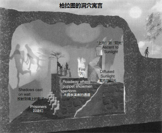 ①"囚徒们"从小被锁在黑暗的洞穴中,他们无法移动,仅能看见被投射到洞穴墙壁上影子。墙上闪动的影子就像电影屏幕上的画面一样。这些"囚徒们"相信他们看见的就是"实相",但这只是木偶的投影。他们同样把背后传来的回声当做影子发出的声音。洞穴另一边有个出口,透进微弱的阳光。