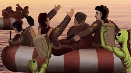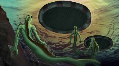 科⾥:嗯,这些都是⽔⽣物。他们⻓⼤在⽔环境中。与它们交往是很奇怪的,因为你从它们⾝上看不到相类似的形像——与⽔⽣物完全不同的参考框架。他们来这⾥是研究海洋的各个⽅⾯。他们不仅不关⼼我们和我们正在做的事情,他们也⽆法忍受我们,因为他们认为,我们污染了⼤海,并且不与环境保持平衡。我们正在影响他们在海洋中所做的实验——他们的基因实验计划。