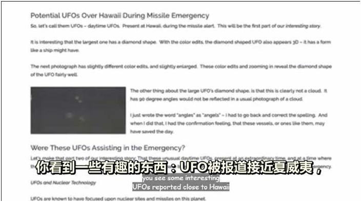 科⾥:——这个假导弹警报。但是如果你看更深的新闻,你看到⼀些有趣的东⻄:UFO被报道接近夏威夷,在那段时间内,天空中出现怪诞的电晕现象。还有,有⼈报道爆炸。在天空中,可能是⼀颗流星。嗯……