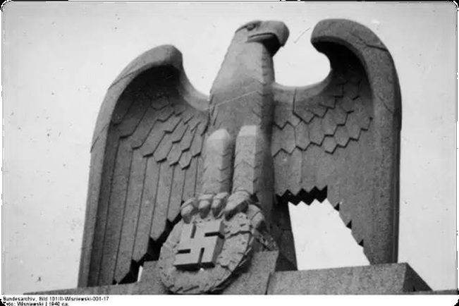 科⾥:是的,残破不堪的建筑有鹰⽖纳粹党徽图案和⽤德语写的话,德语的⽂字,但是任何有价值有⽤的信息都被去掉了。