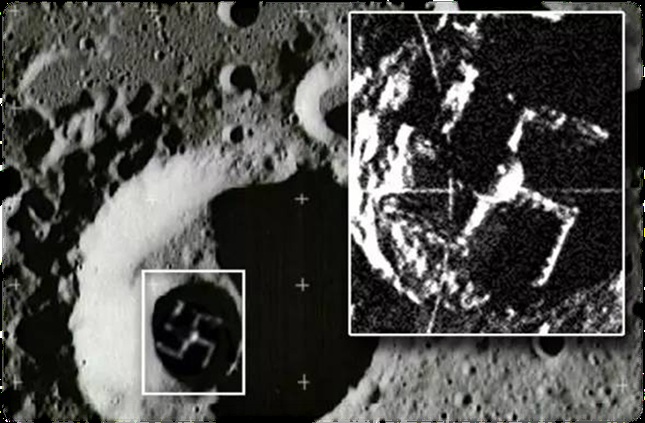 科⾥:本来确实是纳粹徽章的形状,那座建筑现在成了⽉球作战指挥部,被整修过很多次。现在只在⽉球作战指挥部占很⼩的⼀部分,地球秘密太空项⽬经常⽤到这个指挥部。没有⼈能靠近梯形的⽉球基地,除了天⻰⼈和他的⼈类盟友。据称是纳粹⽉球基地的照⽚
