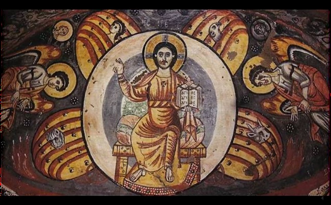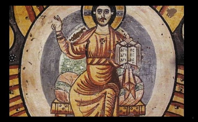 威廉姆•亨利:让我们来看公元后四世纪,这是来⾃埃及。这个图像是我在埃及开罗科普特博物馆拍的。科普特⼈是古埃及的基督徒,他们认为⾃⼰掌握基督教最原本的故事,这个原版与现代⼤众所持的概念有很⼤差异。最重要的是我们⼜看⻅耶稣在⼀个蓝球内持书端坐。这画的是扬升的场景。
