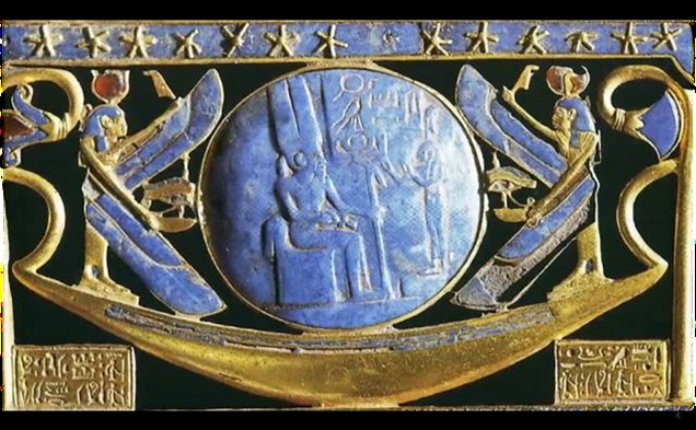威廉姆•亨利:再看看这个例⼦,真是⾮同⼀般。这个法⽼坐在他的王座上,⼿持我们⻅过的重要的神器、神杖、钥匙。他是坐在船上,⻜船上。那叫做“永恒之舰”,也有⼈叫做“百万年⽅⾈”。百万年⽅⾈,这有什么含义?