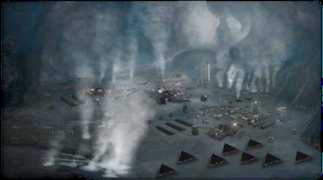 科⾥:就我看到的情况来说,那些基地位于冰层下。它位于南极洲的⻄北部,所有地热活动都发⽣在那⾥。冰层下有来⾃地球的地热。这使得基地看起来基本上就像⼀个巨⼤的圆顶冰屋。他们⼤概运⽤爆破等⼯程技术清理出了部分区域,以使其符合他们的需求。但天花板区域⾼出地表300⾄600英尺。⼭峰向上耸⽴,并消失在冰层顶部。⽽南极洲实际的地表上有许多圆顶铁铸建筑,就像你在空军基地看到那样。那⾥有⼀些那样的建筑。那是个⼯业型城市。他们的灯光会从冰洞的天花板上反射回来。