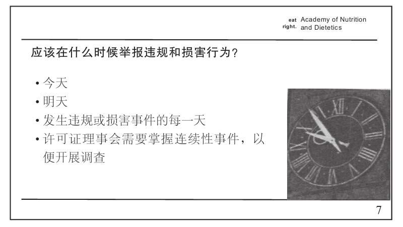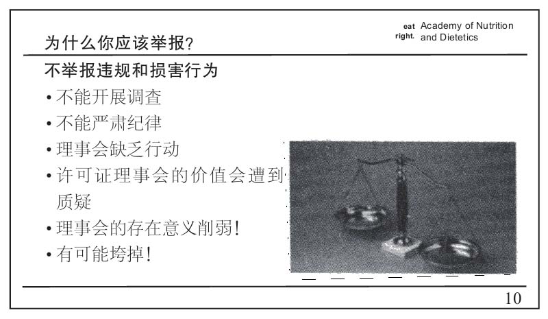 注意图18–1中的最后一个着重号:“许可证理事会需要掌握连续性事件,以便开展调查。”没有连续性投诉,许可证委员会就无所事事。另一页幻灯片发出了“垮掉”的风险警告:有懈怠行为的理事可能因执行不力被解职。营养师们必须让他们忙碌起来!演示幻灯片再次显示了超越本人的雄辩能力,如图18–2所示。