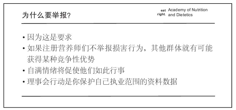 与遭到饮食业威逼的大多数人不同,波珀进行了回击。她自掏腰包,花费数万美元在该州聘请了几位顶尖律师,最终让自己的企业在俄亥俄州成功取得了合法地位。她通过电子邮件和我分享了一个演示幻灯片。这是俄亥俄营养学理事会前任执行理事、营养与饮食学会许可证工作组现任组长凯·梅维科(Kay Mavko)发出的,他在幻灯片中敦促并指示当地的营养师向州许可证理事会“上交”他们的竞争对手。为了避免你认为我对营养与饮食学会的真实目的存在猜疑和偏执成分,我对一些幻灯片进行了复制,见图18–1~图18–3。