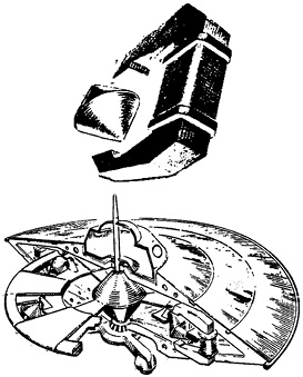 在昆虫翅膀中发现了重力屏蔽效应的维克多•格列别尼科夫博士成功地运用这些发现建造了一个大到他能够乘坐驾驶的飞行器。他把许多翅鞘层叠组合在一起,像活动百叶窗一样可以打开闭合,并且打开的时候就像一把东方的扇子。当你把它们的顶端彼此交叉在一起时,翅膀的升力会得到极大的增强,并且这个力学系统能允许他控制整个过程。当它们彼此堆积在一起时,他得到了 很多“垂直提升器”。他把这个机械系统做成了一个小型的矩形的木质盒子: “我选择了矩形的设计,是因为它更容易折叠起来,而且一旦折叠后,看起来就像一个手提箱或者画具箱,很容易伪装,并且不会引起任何怀疑。所以我把它做成了一个画箱的外形。”整个装置打开后,就像一辆小型的滑板车(参照插图29),格列别尼科夫博士站上去后就能操作它悬浮起来。整个装置通过一个自行车刹车钳来开闭像扇形的翅鞘层以控制垂直推力,通过第二个刹车钳来改变翅鞘层的倾角以控制前进速度。他通过倾斜身体来进行驾驶,并把自己固定在支撑自行车手柄的金属柱子上。维克多•格列别尼科夫对其在使用这个装置时所发生的现象的解释非常符合我们的模型,这意味着他的发明应该是非常真实可信的。