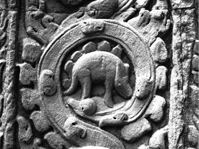 (插图47)柬埔寨的塔普伦寺外墙上的雕刻,其他类似的雕刻描绘了传统的动物,比如鸟类、鱼、水牛、猴子、麋鹿和蜥蜴 。 但是上图的动物看上去非常像剑龙。