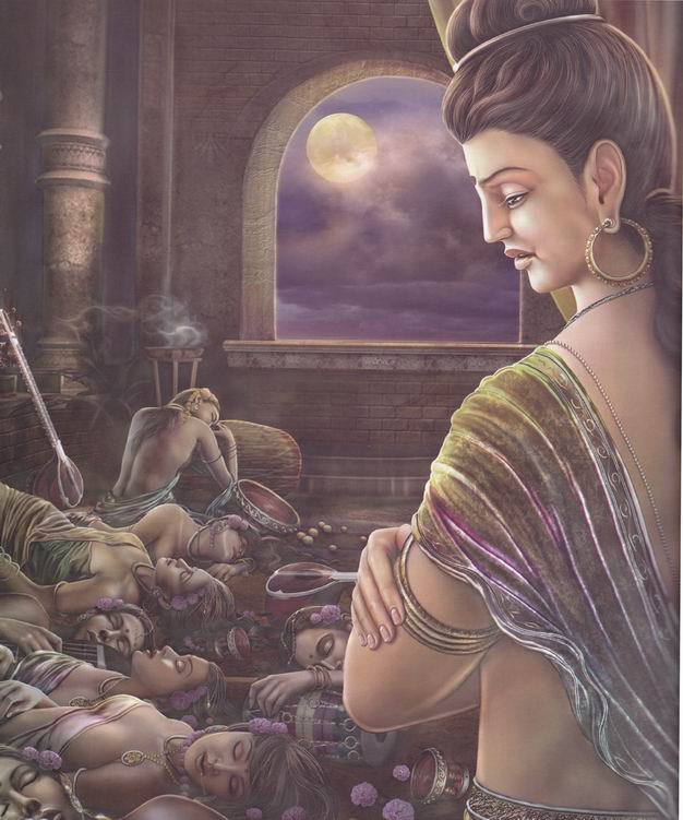 见丑生厌:太子夜见宫女们的睡觉时的丑态,对轮回生起了极大的厌恶。