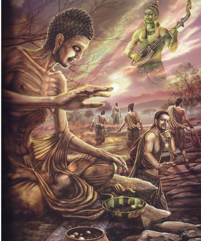 难忍苦行:悉达多向所有世间的“成就者”们求学,尝试了世间所有的修行方式,达到了世间能达到的所有顶端境界,但他发现并没有达到他出家的目的,于是放弃了苦行。见天神于空中弹琴,了悟了中道。