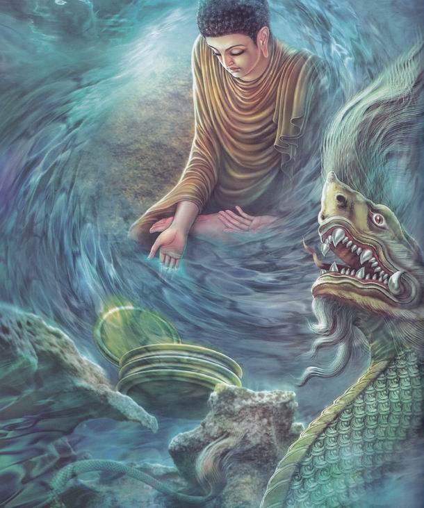 树下参悟:佛陀于菩提树下参悟,发誓不成正觉不离此座。当雨水下落天气寒冷时,龙王现身为佛陀遮风挡雨。