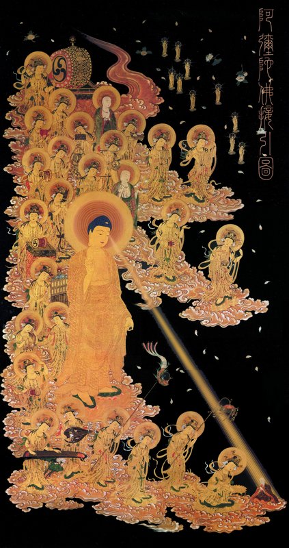“上品下生者,亦信因果,不谤大乘,但发无上道心,以此功德回向,愿求生极乐国。”“行者命欲终时,阿弥陀佛,及观世音、大势至、与诸菩萨,持金莲华,化作五百佛,来迎此人。五百化佛,一时授手,赞言:‘法子!汝今清净,发无上道心,我来迎汝!’”“见此事时,即自见身坐金莲华,坐已华合,随世尊后,即得往生七宝池中,一日一夜,莲华乃开,七日之中,乃得见佛。虽见佛身,于众相好,心不明了,于三七日后,乃了了见。闻众音声,皆演妙法,游历十方,供养诸佛,于诸佛前,闻甚深法。经三小劫,得百法明门,住欢喜地。”“是名上品下生者,是名上辈生想,名第十四观。”