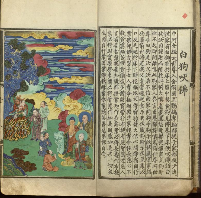 佛对白狗说:“你呀!你是因为舍不得此间的财物,所以才堕为狗身,又来这里守护。”狗听了,心中不胜懊恼,生大嗔恚,却又无可奈何,气得伏在地上直喘息。