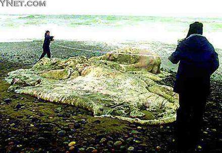 生死书注(2003年7月15日):这张图片摘自上星期的新浪网,是智利海滩发现的一个死去的肉尸体,已经开始腐烂,没有四肢和五官,肉质坚硬难以刀割,身体非常庞大。(后来有生物学家证明说这是鲸鱼的脂肪。)
