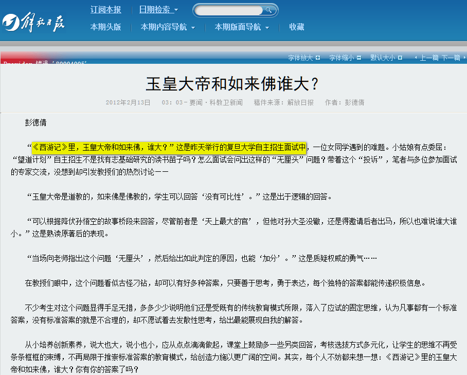 复旦自主招生面试出怪题:玉皇大帝如来佛祖谁大?