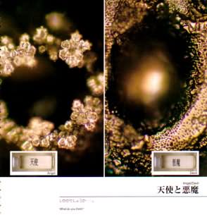 听过‘好可爱喔’的水,结晶体纷纷呈现可爱的图案形状,被诅过‘王八蛋’的水,一片灰暗混浊,无法结晶;