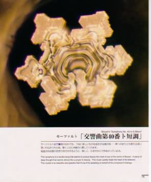 有一天,江本博士研究组的一位摄影师忽然提议说:‘让水听听音乐,看看会有甚么样的结晶吧。’更难以置信的事于是接二连三发生了,他们发觉: