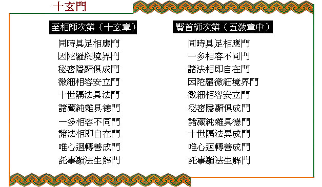 (术语)又曰十玄缘起。华严宗所立。示四种法界中事事无碍法界之相者。通此义,则可以入华严大经之玄海,故曰玄门。又此十门互为缘而起他,故曰缘起。至相大师,承杜顺之意,创说于十玄章,贤首于五教章中卷敷演之。但次第不同。然贤首更于探玄记一说十玄,稍异于此,清凉全依之。