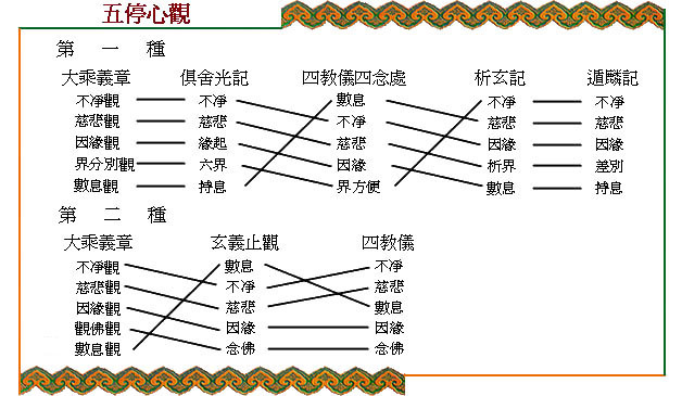 (术语)小乘三贤之第一,修五种之观法而五种之过失停心也。是为声闻乘入道之初。有二种,一种:一、不净观,观境界不净之相,停止贪欲之法。贪著心多之人修之。二、慈悲观,向一切有情,观可怜之相,而停止嗔恚之法。嗔恚多之人修之。三、因缘观,观十二因缘,三世相续之理,而停止愚痴之法。愚痴多之人修之。四、界分别观,向诸法而分别六界或十八界,停止我见之法。我见多之人修之。五、数息观,计呼吸数以停止散乱心之法。散心多之人修之。又一种:以第四之界分别观与第三之因缘观相似,省之而加观佛。因观佛之相好。能治一切之烦恼故也。业障多之人修之。净影于大乘义章十二正明第一种,傍示第二种。曰:“问曰:有人诸患等分何以为治?成实法中十六特胜能为对治,依如观佛三昧经中观佛三昧能为对治,毗昙法中义亦同此,以佛相好非三毒境界故尔。”天台于四教仪、四念处、名第四观为界方便,而举第一种。于玄义、止观即、为念佛观,而举第二种。图示其次第并名字之不同,则如图。