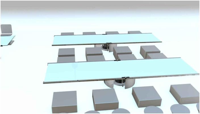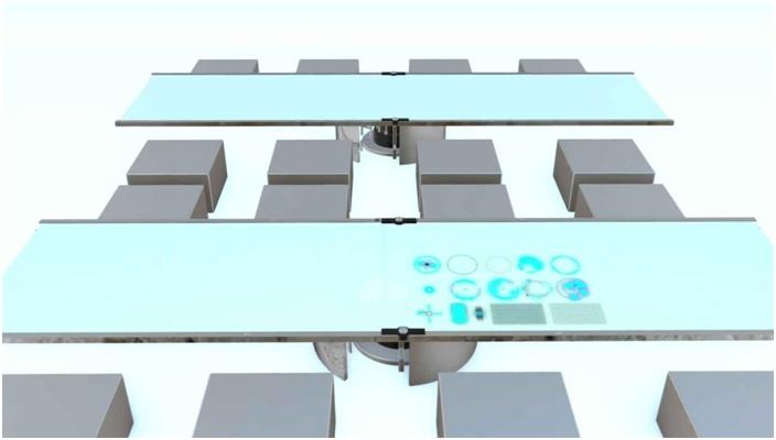 ⼦。⼀张桌⼦可以容纳10-20个⼈,根据那⾥的⼈数。然后有些只是⼀般桌⼦。摆放在地⾯上,当你⾛到桌⼦旁,你开始坐下来时,椅⼦就会从地⾯升上来。真的很整洁。它看起来并不像——你会认为你会听到机械的声⾳,就像在椅⼦上升时。但它却是静悄悄地从地⾯升出来。它们的尺⼨⾮常相似。正常从地⾯出来的,⼏乎都是直径1.5英尺左右。每个⼈都知道餐具在哪⾥。你所需的调味料和所有东⻄都在桌⼦上。所以你有这个⼤型的野餐桌,我们会说,它全都是⽤钢制成的。看起来像钢铁。不是不锈钢,像磨砂钢。桌⾯看起来就像是⼀块⼿机屏幕。我的意思是,桌⼦本⾝。所以当你⽤⼿在桌⾯上做出⼀个特殊动作时,就像把⼿平放是餐⼱,双重敲击是叉⼦,⼑⼦和勺⼦。当你这样做时,餐⼱实际上会从桌⾯下露出来给你取。我不知道这是什么技术。但是不⽤滑开⾯板。没有门可以打开,这些调味品或类似的东⻄露出来。这⼀切都只须要敲击并移动你的⼿,以获得⼀些东⻄。如果你不知道如何做到这些,他们确实会教你使⽤不同的⽅法,你可以把⼿放在桌⾯调味品区域上,桌⾯就会出现⼀些直观的应⽤程序。它显⽰⼀张⻄红柿酱的图⽚,⼀张芥末酱,烤⾁酱和所有这些⼩图⽚。⼀切都是图⽚。没有⽂字。你可以点击⻄红柿酱或其他任何东⻄,同样的事情会发⽣。⽆论在这张桌⾯下是什么,在调味品所在的区域,都会变得不像固体。它开始变得清晰,然后你可以看到那处桌⾯下的调味品了。