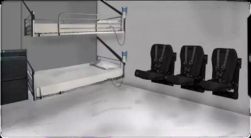 科⾥:这是⻜船上他们审问我的⼀个⼩区域。实际要⽐图⽚更严密狭窄,更⻓⼀些,但更窄。是的,那个床,有IVPOSTS(某仪器)折叠在床的⼀边。他们让其中⼀个弹出⼀个IV到我⼿中。