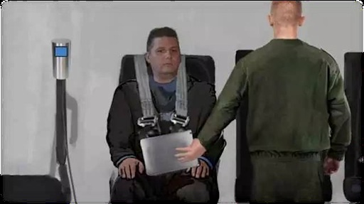 ⼤卫:现在我们有另⼀张图,我们看⻅你被绑在椅⼦上。并有⼀个军⼠站在你⾯前,拿出⼀个像平板电脑的东⻄,你正在看著平板。
