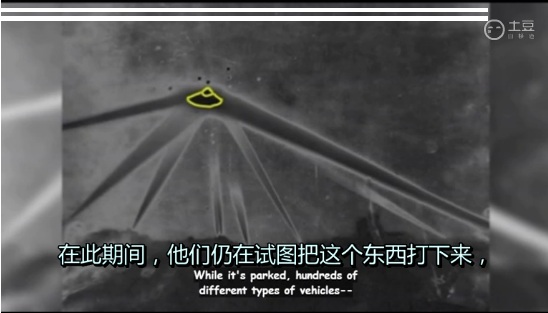 明⽩了吧?所有的⾼射炮都开始射击。我们跑到外⾯。就在我们头顶上⽅有个⾮常庞⼤的东⻄,⼤概有这么⼤,离地可能有7,000英尺左右。⾼射炮炮弹在它的底部附近不断爆炸。炮弹射击时,有⼋个探照灯都将光束集中在这个东⻄上。当然了,它什么事都没有。它在那⾥停留了⼀个半⼩时。在此期间,他们仍在试图把这个东⻄给打下来,⽽有数百个不同类型的⻜⾏器—⼤多为圆形,有些庞⼤的⻜⾏器则呈雪茄形状—它们⻜到其遭受炮⽕攻击的下⽅。