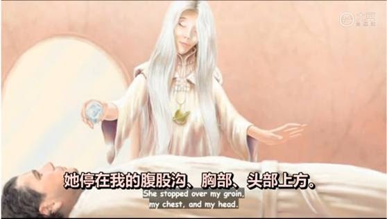 科⾥:我能听到。但我没有感觉到声⾳在我的⽛⻮中或是在什么地⽅发出,因为我曾有过这种感觉。然后她握住⽔晶棒,停在我⾝体上⽅。它开始发出⾮常刺⽿的噪⾳。我开始看到头部、肩膀的轮廓,[快速移动声],好像有六个⼈形从我的腹股沟、胸部还有头部钻出来。我感到极度不安。