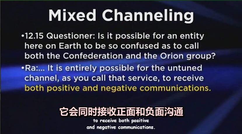 ⼤卫:哦,这就是我们要在这⾥谈的,现在我们谈到真正重要的内容了,地球上的某个实体是否可能如此混乱以致于同时接收猎户座联盟和⼤联盟的⼼灵感应,我们来看答案,对于未调谐的信道这是完全可能的,正如你称呼这种服务为通灵,它会同时接收正⾯和负⾯沟通。