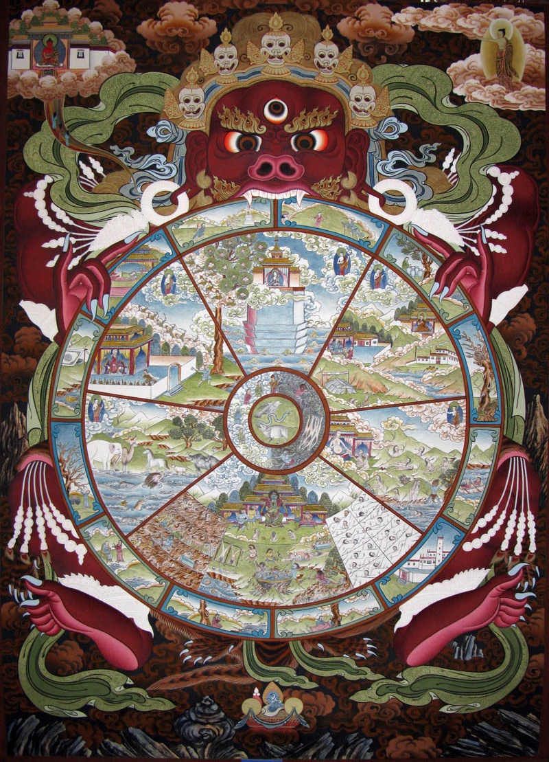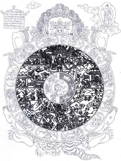 生死之轮,正是开示我们凡夫不断地在六道中轮回之境况、过程及原因,并开示脱离这种无奈境况的方法。虽然六道之苦况包罗万有,但其大概情况已全包含在此图像之中了。