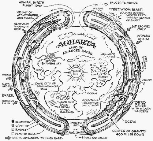 1.所 有的行星都是中空的,包括地球在内。行星是由太阳甩出的热气团进入环绕太阳的轨道而形成的,其外壳是重力和离心力造成,两极则保持敞开的状态,直通到中空 的内部。这个过程会形成一个中空的球体,并具有内部太阳,发射出舒适宜人的阳光,让地心世界非常适合植物生长与人类生活,在那里,太阳不会下山,所以没有 晚上。