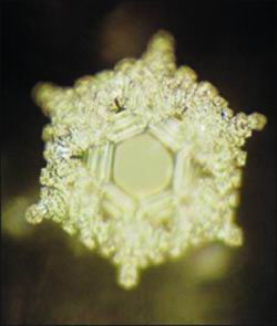 着手实验两个月后,终于拍到了第一张水结晶的照片。那是一张非常美丽的六角形的水结晶。欣喜若狂的研究员来向我汇报这一情况时,我也不禁心内一热。