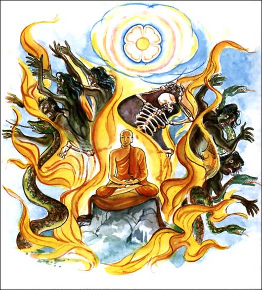 有如火焰,那不放逸的僧人趋前把一切大小的束缚烧得一干二净。