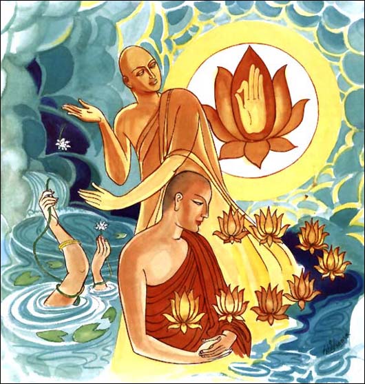 斩断情欲如亲手折断秋莲,追随涅盘安乐之道。