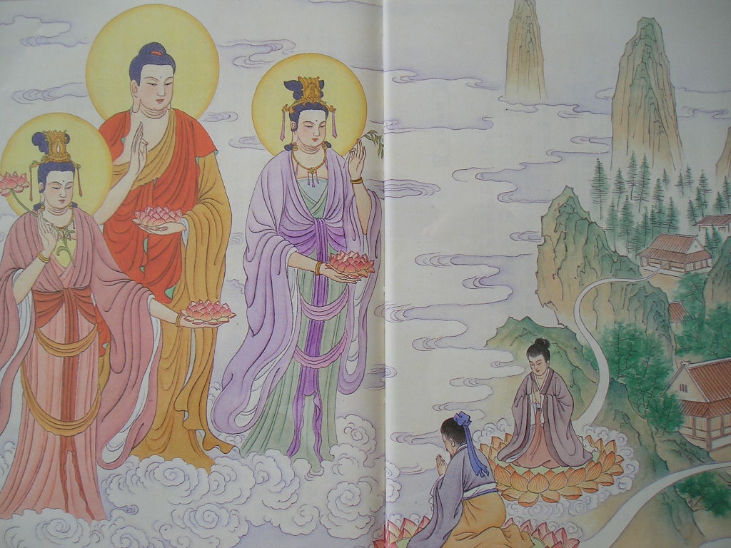 念佛的人临命终时,一心不乱,如入禅定,西方三圣将手持莲台,现其人前,慈悲加佑,接引往生极乐世界清净佛土。