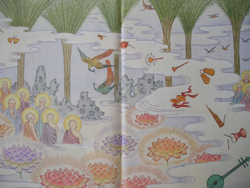 极乐世界的七宝莲池里,有各色各光的大莲花;虚空中更是不停的传来美妙的天乐,音曲和雅,甚可爱乐。