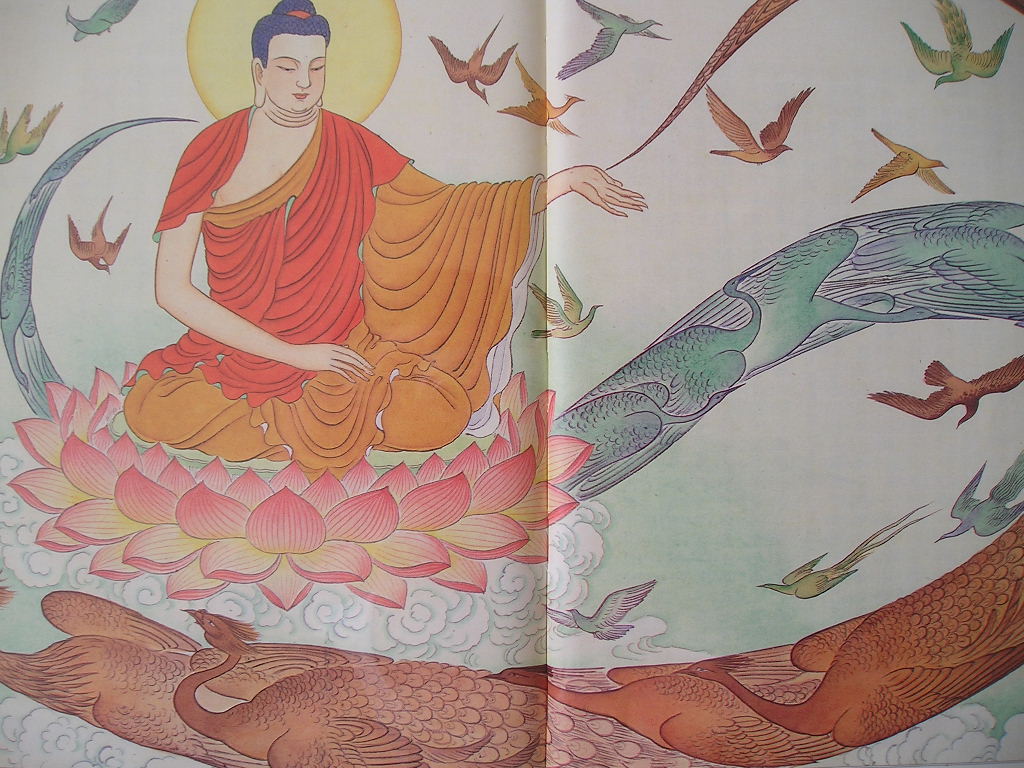 在极乐世界里,阿弥陀佛变化出各种珍禽,昼夜六时,唱出和雅的音声,随其妙音宣扬佛法。众生闻是音已,各得念佛、念法、念僧,无量功德,熏修其身。