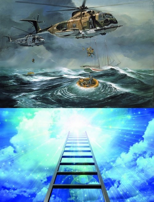 这个直升飞机既然来救人,它一定备有这个梯子,从直升飞机上面把云梯垂挂下来,我们下面的人只要抓住这个梯子的话,只要一上这个梯子,哎!一收、一拽,上去了,就可以安全脱险,是不是这样?