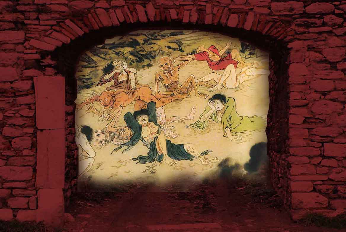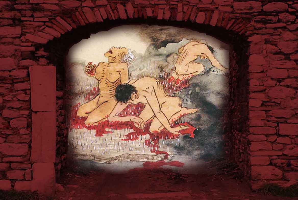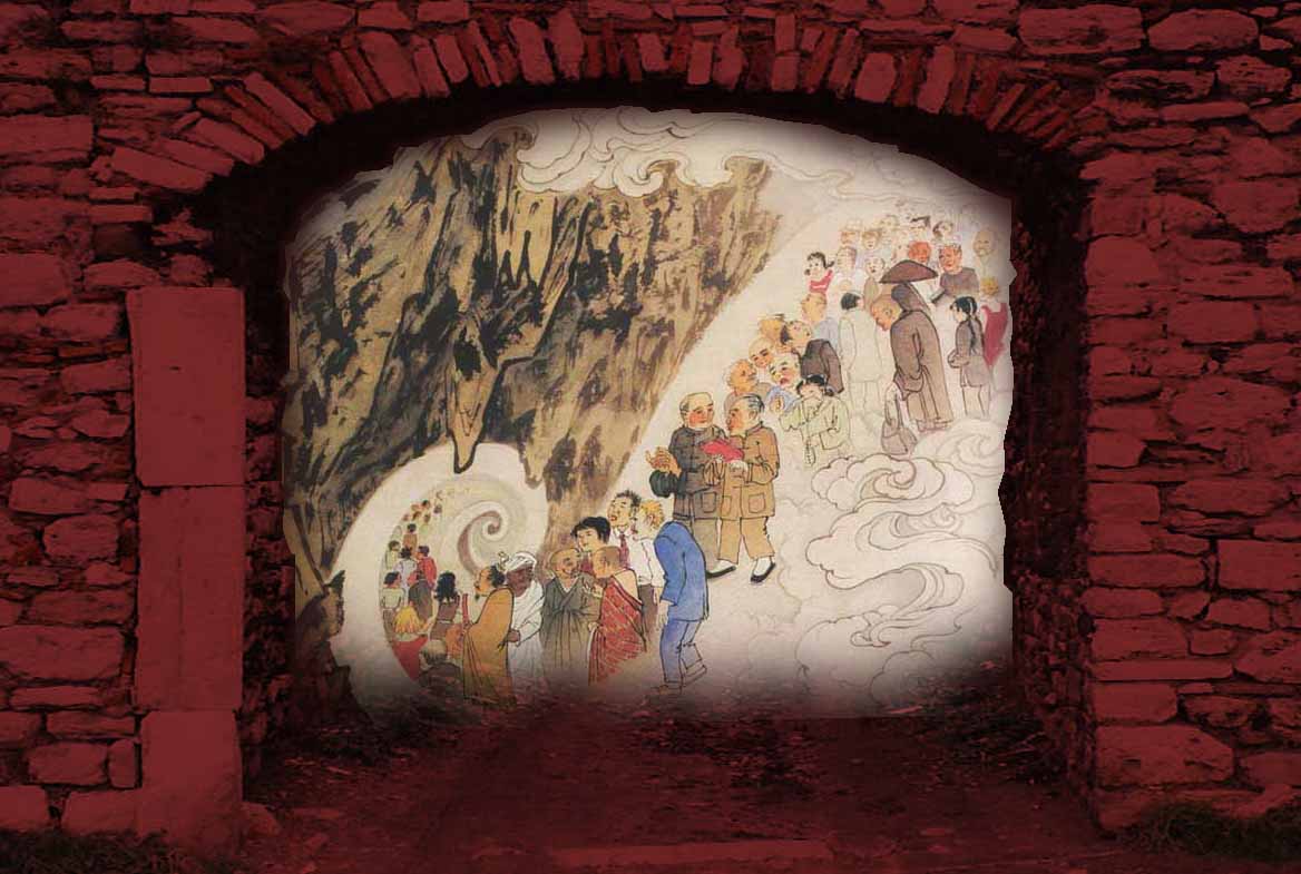 迷朦光中,幾個青面差使,押解一批罪犯,在寒鐵山洞穴中穿梭而過。這批罪犯,個個衣冠楚楚,看得出其生前之顯赫與榮耀,從服飾穿著來看,有不同的階級與地位;有的應該是政客,有的應是掌有權位的學者,在他們的神色之間,依然殘留幾分得意與跋扈。孱雜人群中也有宗教人士、神職道侶,享盡人間一切福報,辜負眾生之供養。此時個個神情凝重,似乎已嗅到「大事不妙」的氣息。