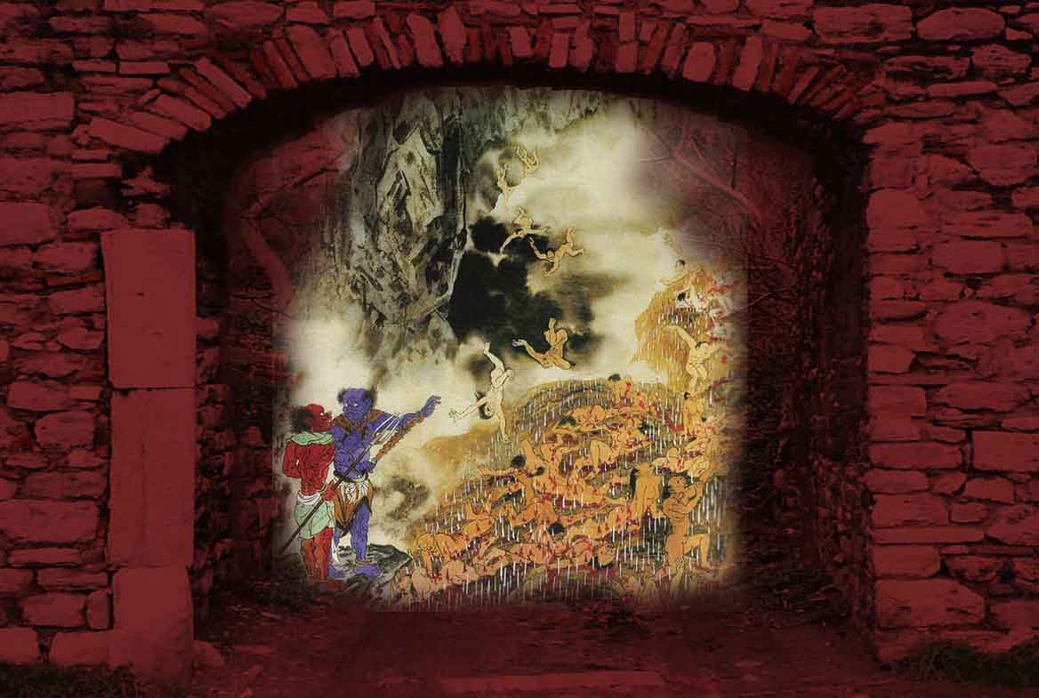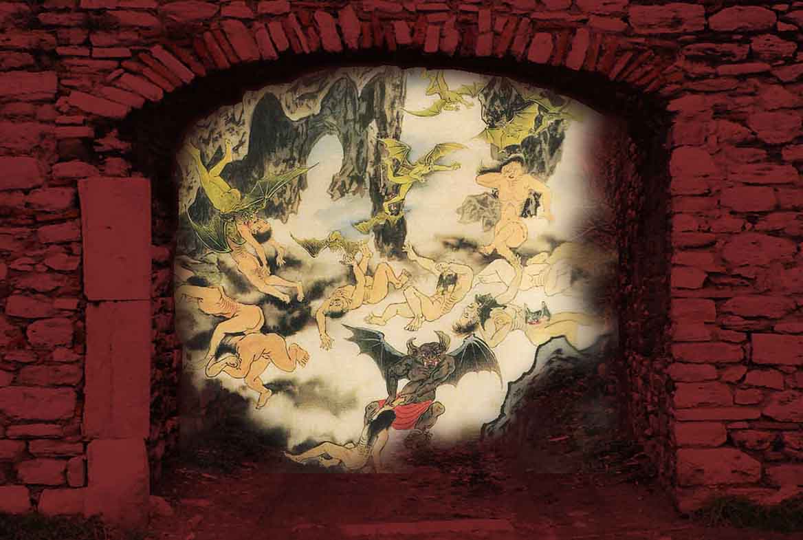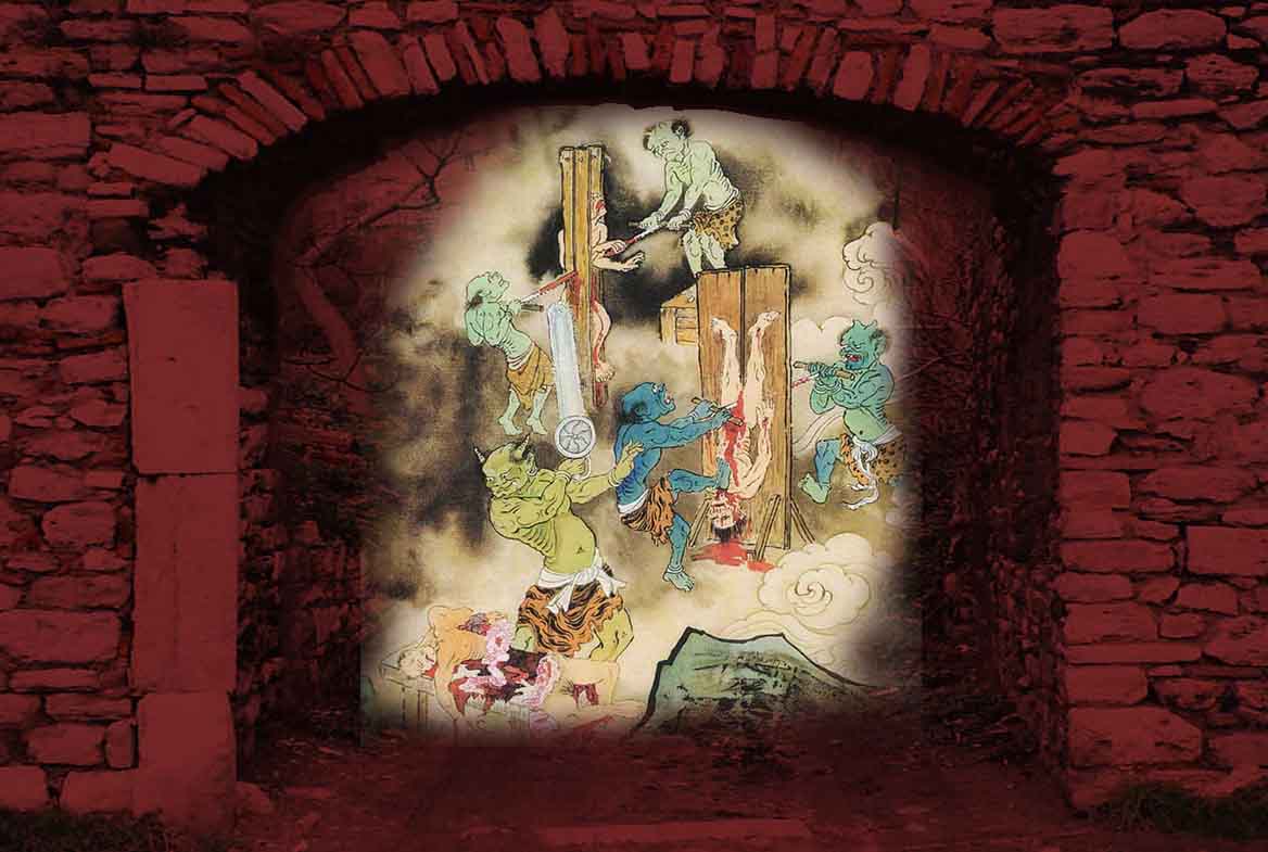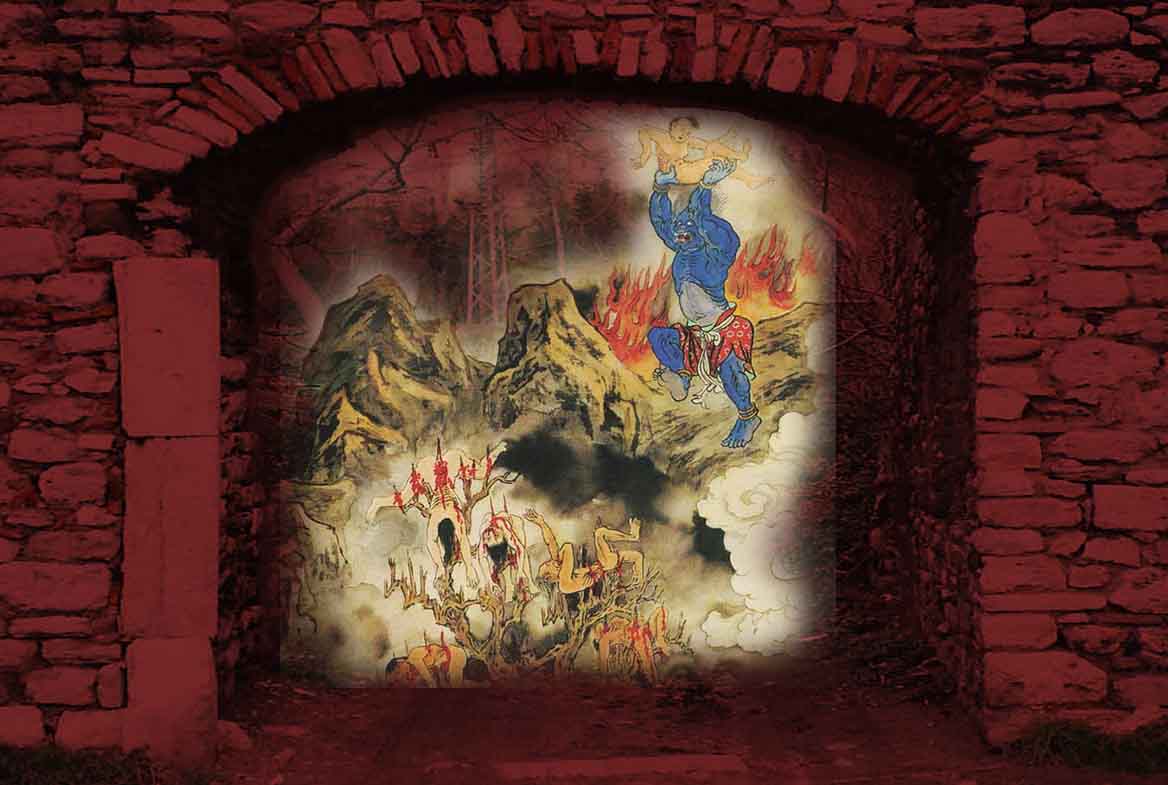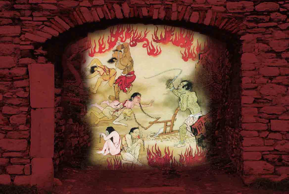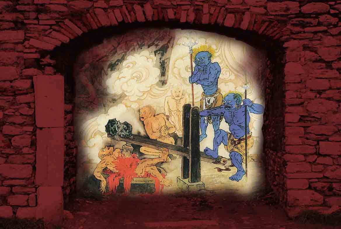 地獄之中,隨時可見成千上萬夜叉厲鬼,血口鋼牙,眼如電光,利爪如鋼鐵,箝制罪犯,押解拖曳至各大小地獄。