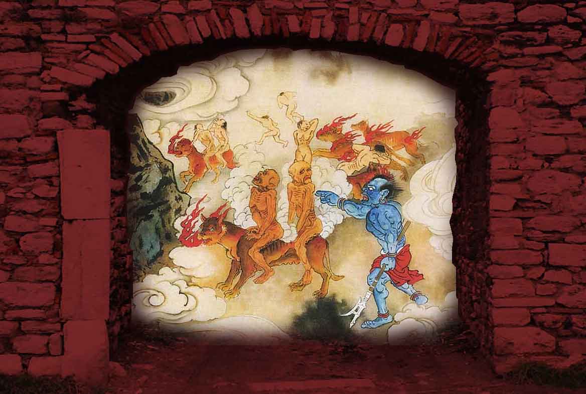 飄過地獄門,巍巍鐵鑄的山巖峭壁,冒著終古不熄的赤燄,一望而無際。報到後的幽魂,不分貧富貴賤或男女老少,每人身邊都伴著一位猙獰可怖的厲鬼「隨從」,如影隨形;以鐵鍊套頸,牙棒摧身,拖拉前進。這些夜叉厲鬼,隨情緒而變色異形,或青、或綠,或人、或獸,十分恐怖。
