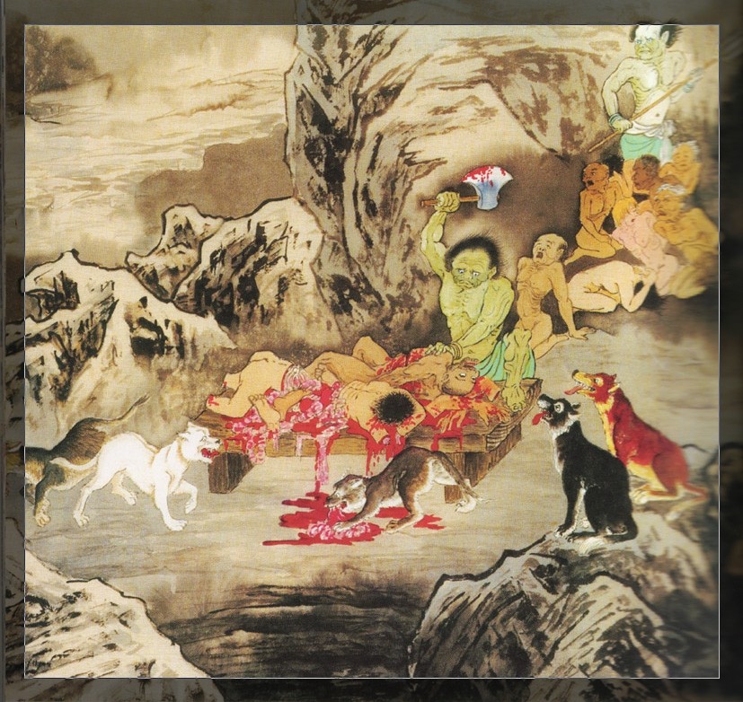 经云:「心业画师,自业画作。」如是因,如是果,怨谁呢?厉鬼现出你生前残酷模样,手执利斧支解你的身体,四周狼群环伺,垂涎等待,不正是你自己感召来的!