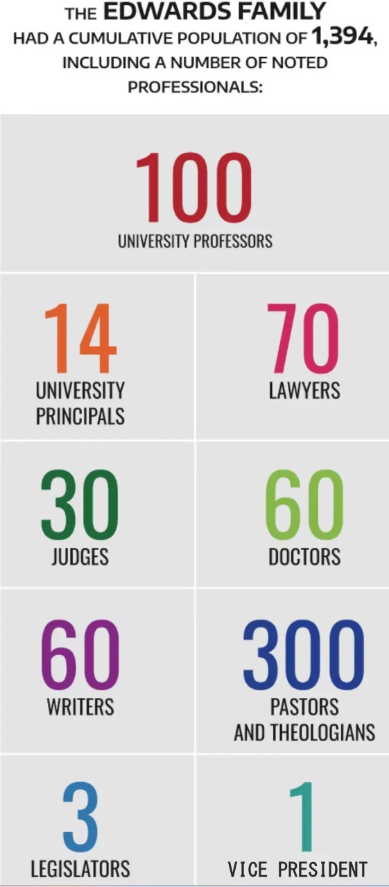 阿尔伯特·爱德华·温西的这项研究分别统计了爱德华兹家族200年后的情况,也统计了马克.尤克斯家族200年后的情况,并列出两大家族详细统计数字结果: