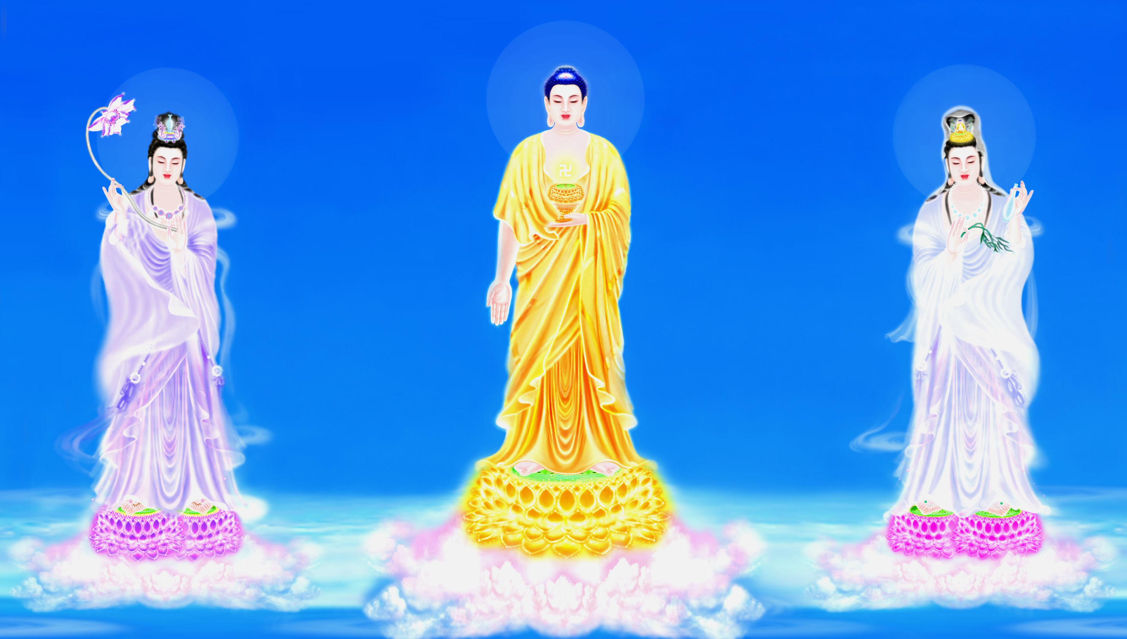 佛告阿难:彼佛国中诸菩萨众,悉皆洞视、彻听八方、上下、去来、现在之事。诸天人民以及蜎飞蠕动之类,心意善恶,口所欲言,何时度脱,得道往生,皆豫知之。又彼佛刹诸声闻众,身光一寻,菩萨光明照百由旬。有二菩萨,最尊第一,威神光明,普照三千大千世界。阿难白佛:彼二菩萨,其号云何?佛言:一名观世音,一名大势至。此二菩萨,于娑婆界,修菩萨行,往生彼国。常在阿弥陀佛左右。欲至十方无量佛所,随心则到。现居此界,作大利乐。世间善男子、善女人,若有急难恐怖,但自归命观世音菩萨,无不得解脱者。